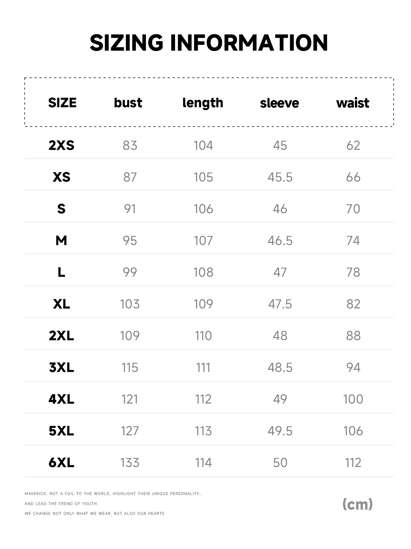 • To find your fit: Measure your body’s bust/waist, then match to the "Bust (cm/in)" or "Waist (cm/in)" columns.